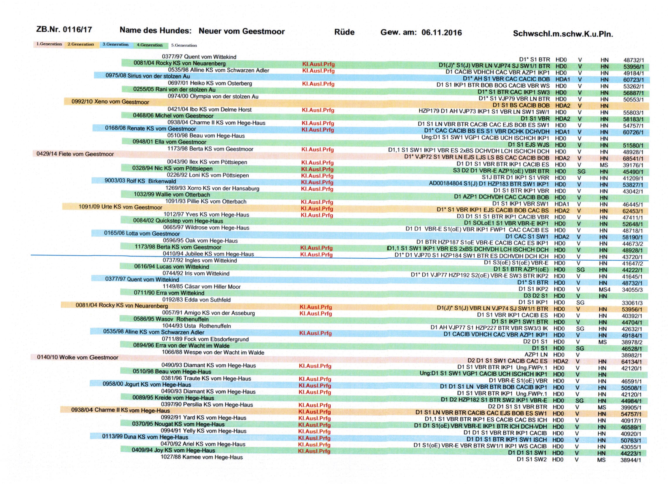 und spurlaut), S 1, SW 1, VGP 1 (4h stöbern ohne Ente), HN, HD-A2, V 1, Vater: Fiete vom Geestmoor 0429/14, Schwschl., VJP72 (sicht- und spurlaut), D 1*, S 1, VGP 1, HN, LN, Vbr., HD-A2, OCD-frei, Europajugendsieger, Landessieger,